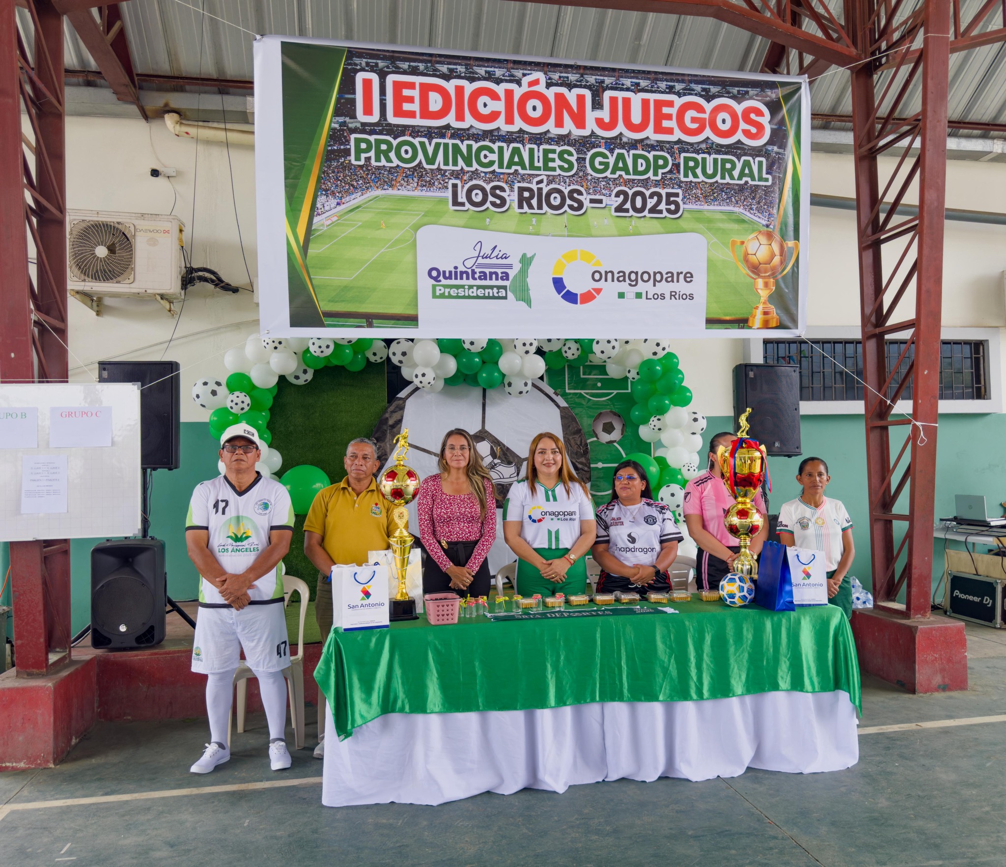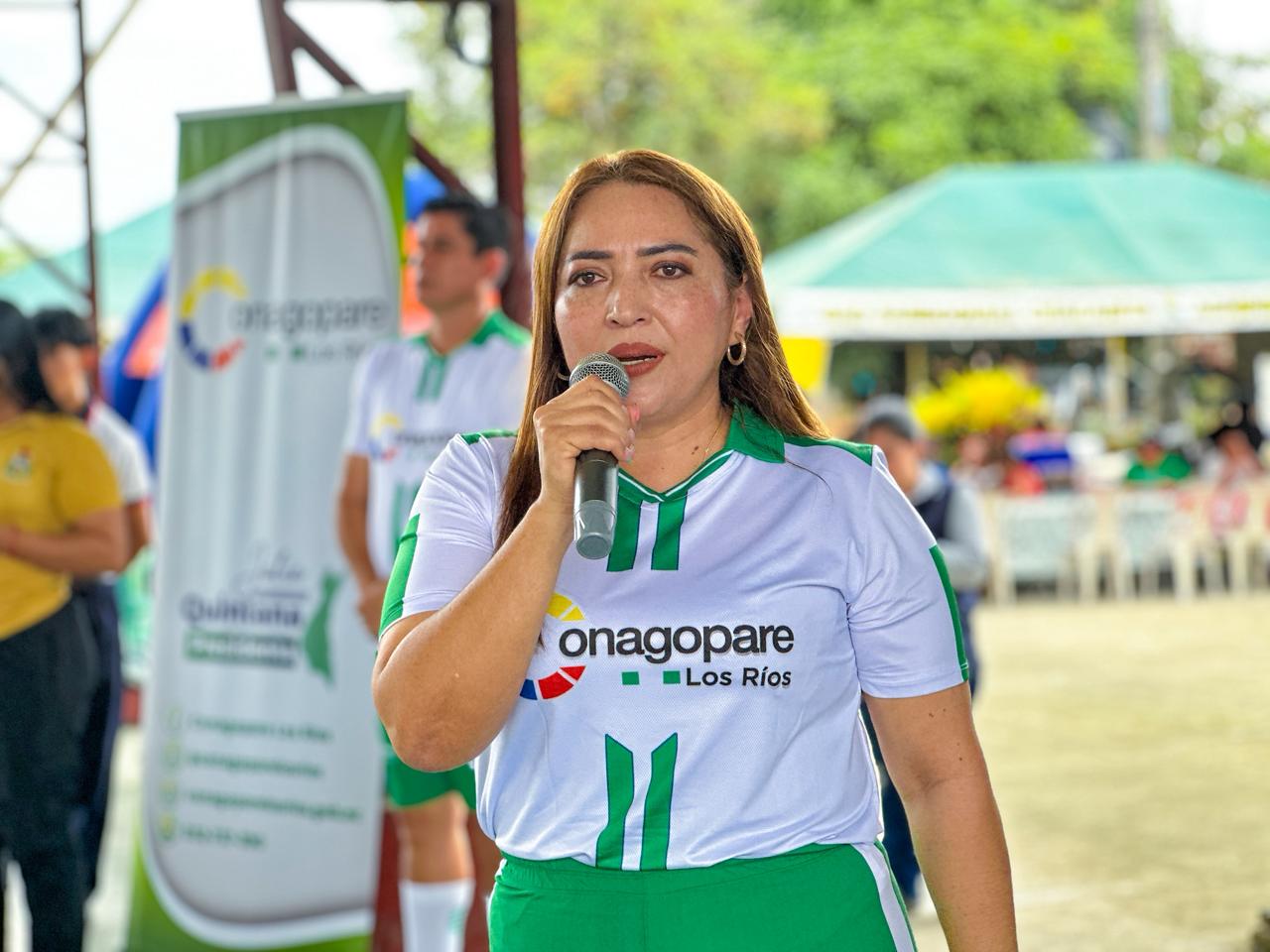 La Ing. Julia Quintana Cedeño, presidenta de Conagopare Los Ríos, brindó un emotivo saludo y fue la encargada de inaugurar oficialmente la Copa, destacando la importancia del deporte para fortalecer la identidad y la unidad rural.